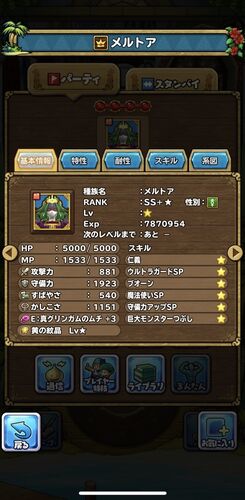 アプリ『イルルカSP(ドラクエモンスターズ2)』のパーティ紹介。超Gサイズにすると最大HPが5000近くになるメルトアにHPバブルをつけ、ときどきリバース、マインドブレイクからの超さそう踊りで相手の行動を制限しつつ、圧倒的な守備力とかしこさで相手を蹴散…